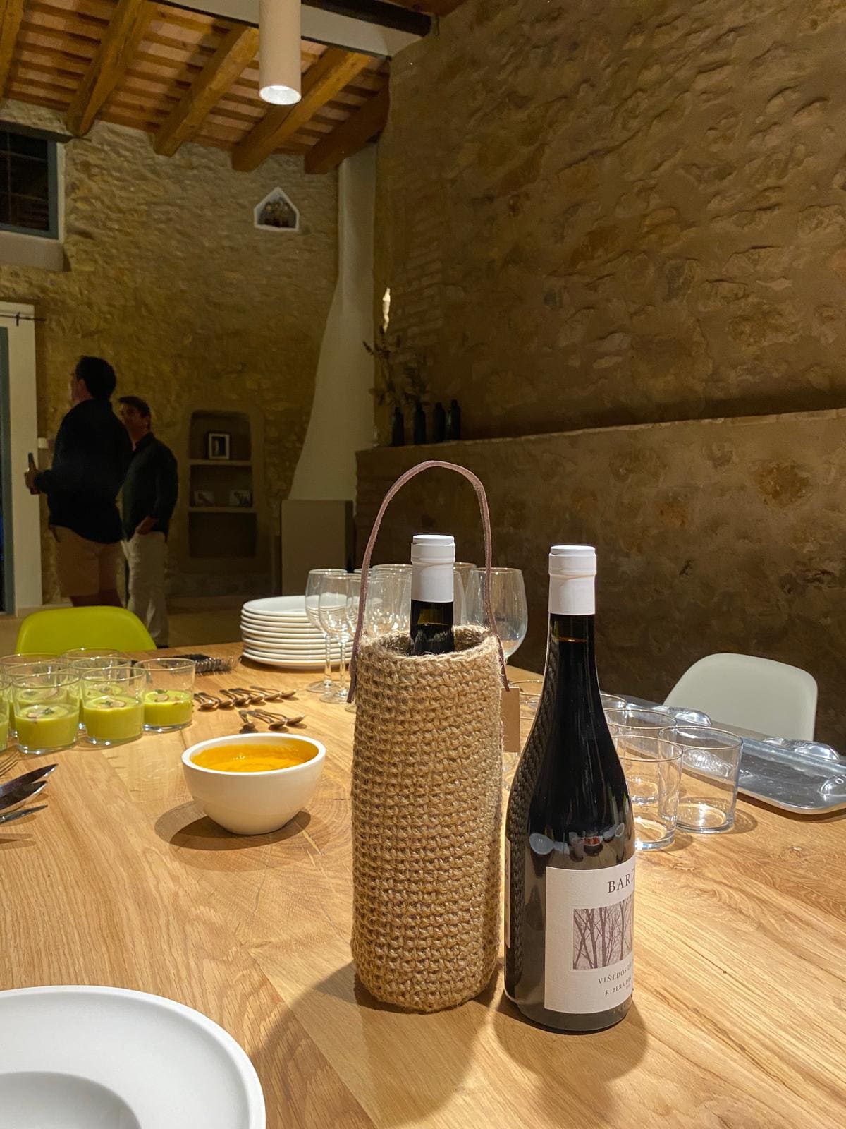 Original portabotellas tejido a mano en yute con el asa de cuero, aunque es muy versátil y también puede servir para poner flores seca o incluso de bolsito.