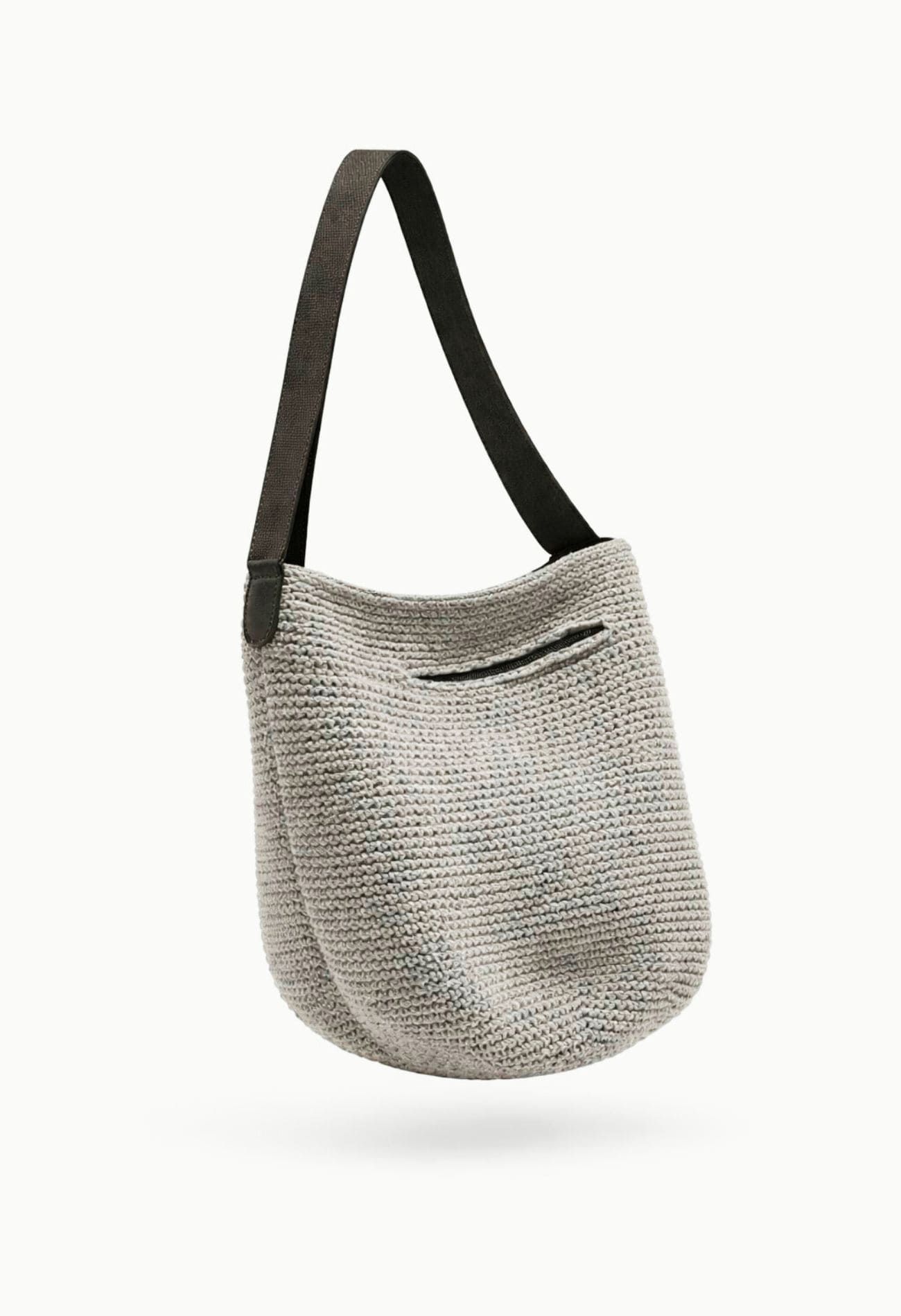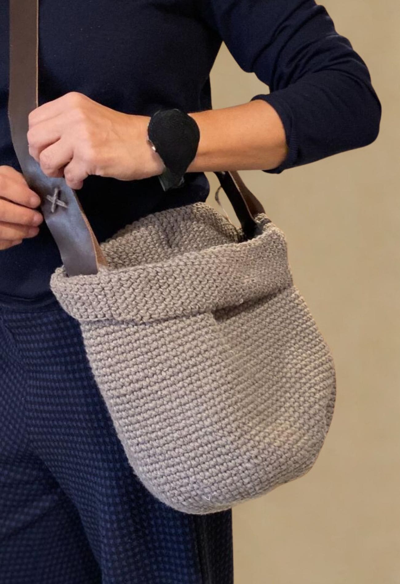 Bolso tejido a mano en lana de gran capacidad y versátil disponible en dos tamaños y colores. Va forrado con tejido de pana o de cheviot en función del color (marrón o gris, respectivamente), con un bolsillo muy práctico en su interior.