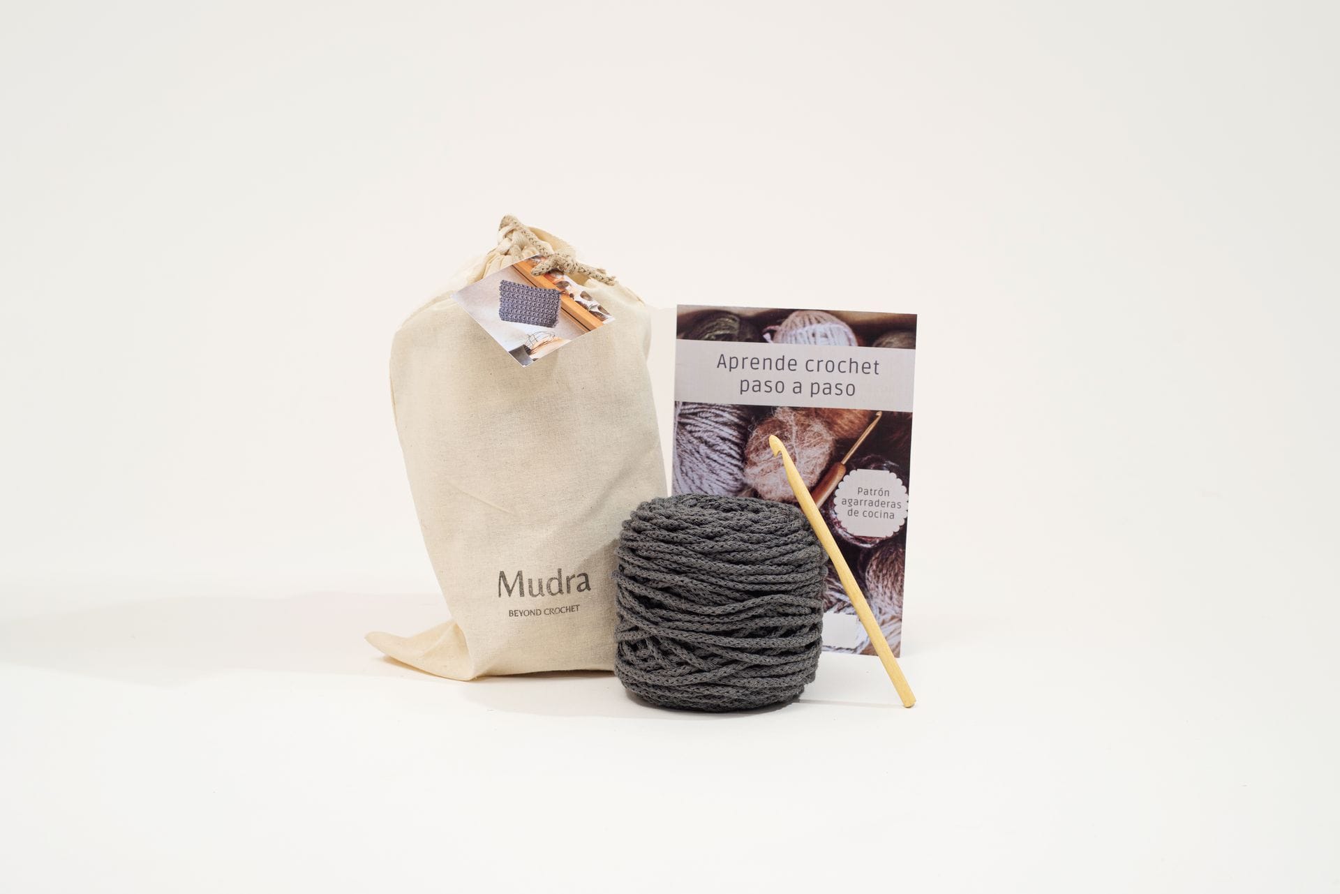 Kit para tejer dos agarraderas de cocina. El saquito del Kit incluye 2 ovillos de algodón (disponible en dos colores), la cinta de cuero, la aguja de ganchillo del número correspondiente y el patrón con el detalle de los pasos y punto a tejer.