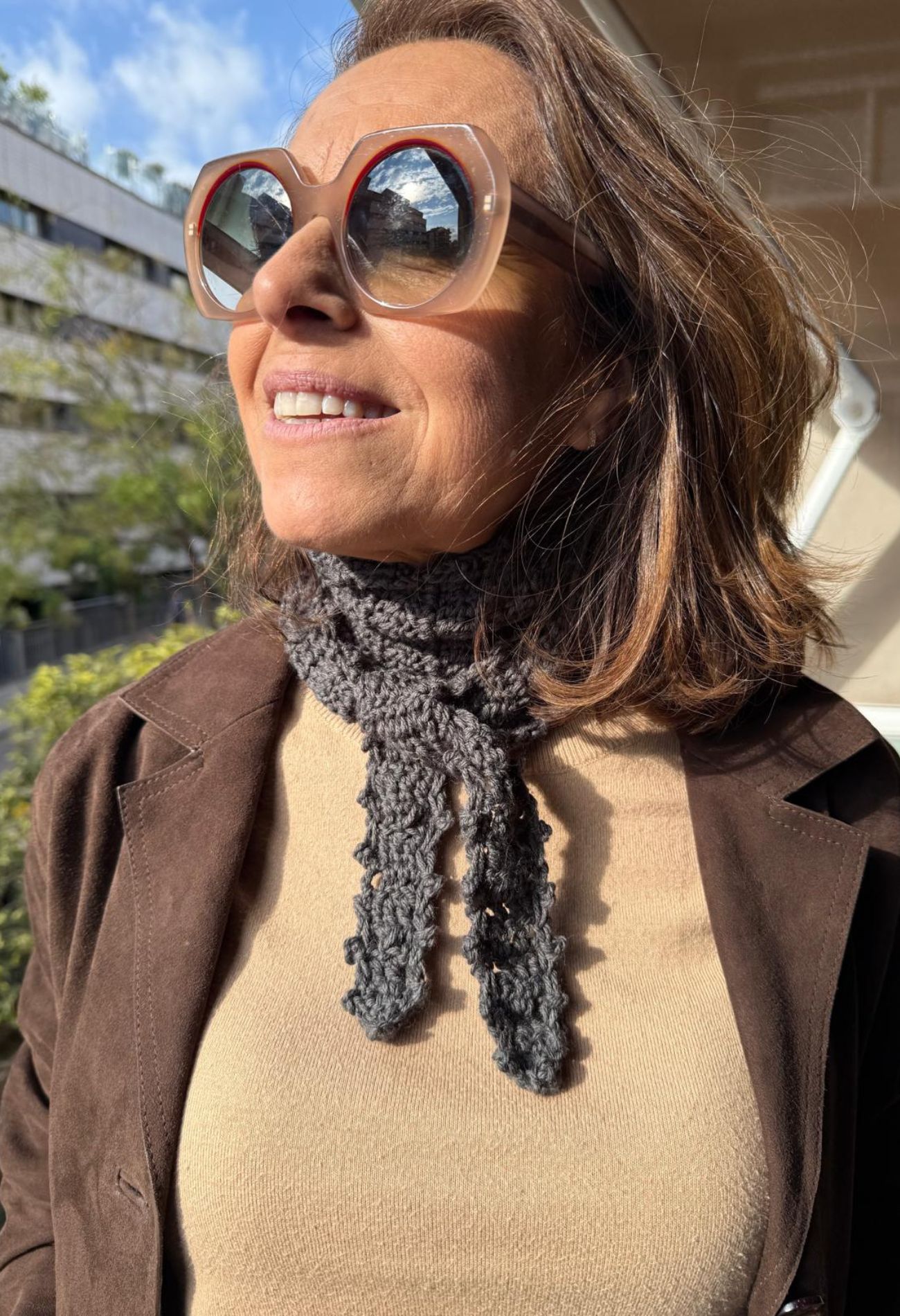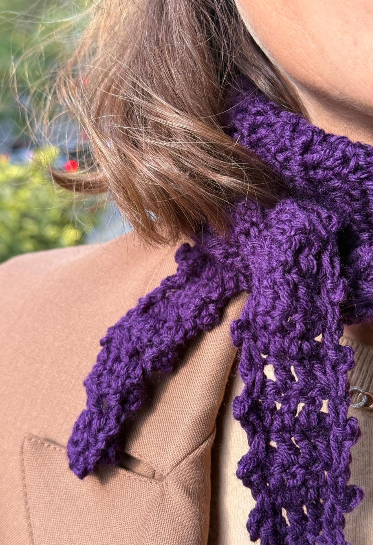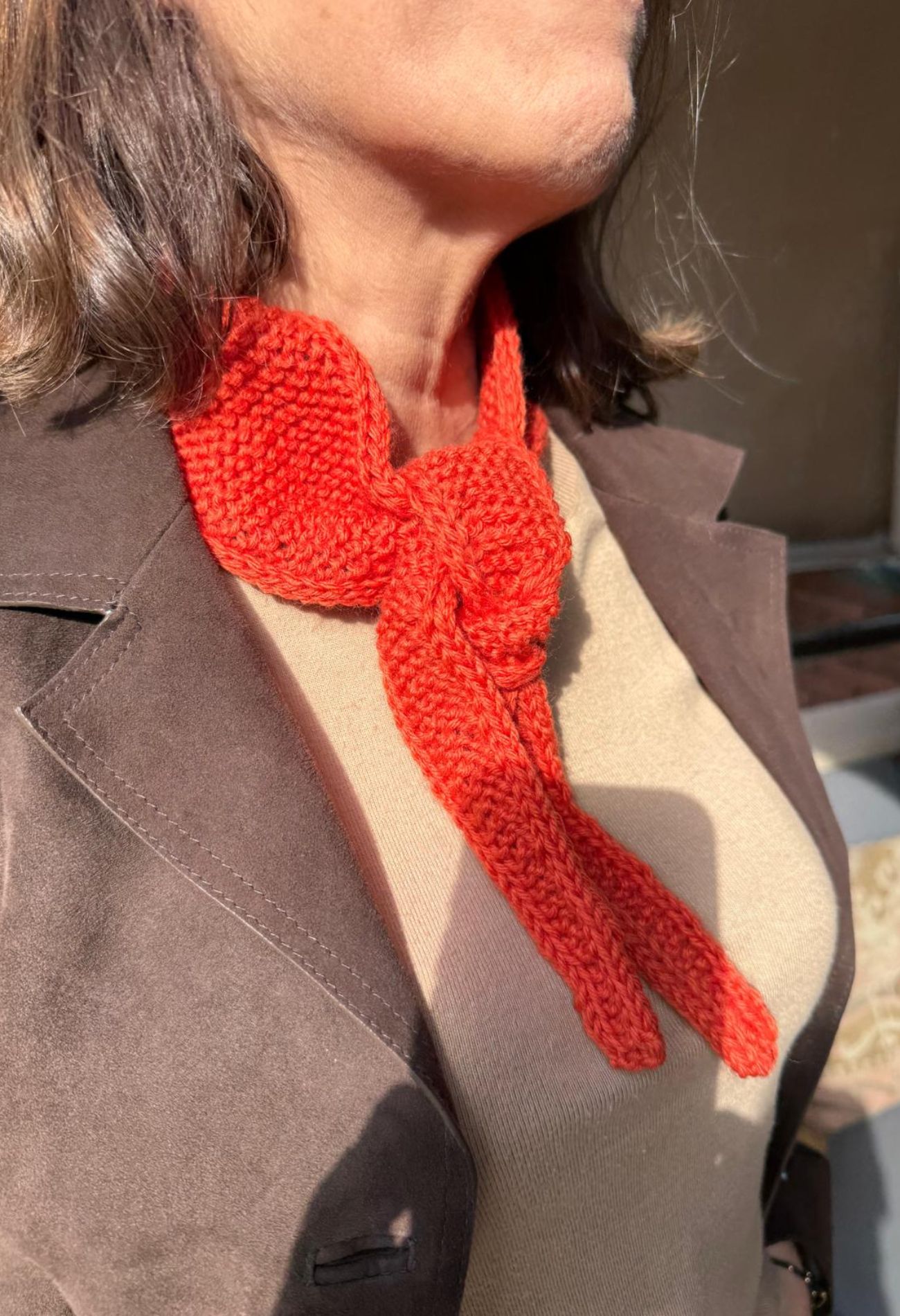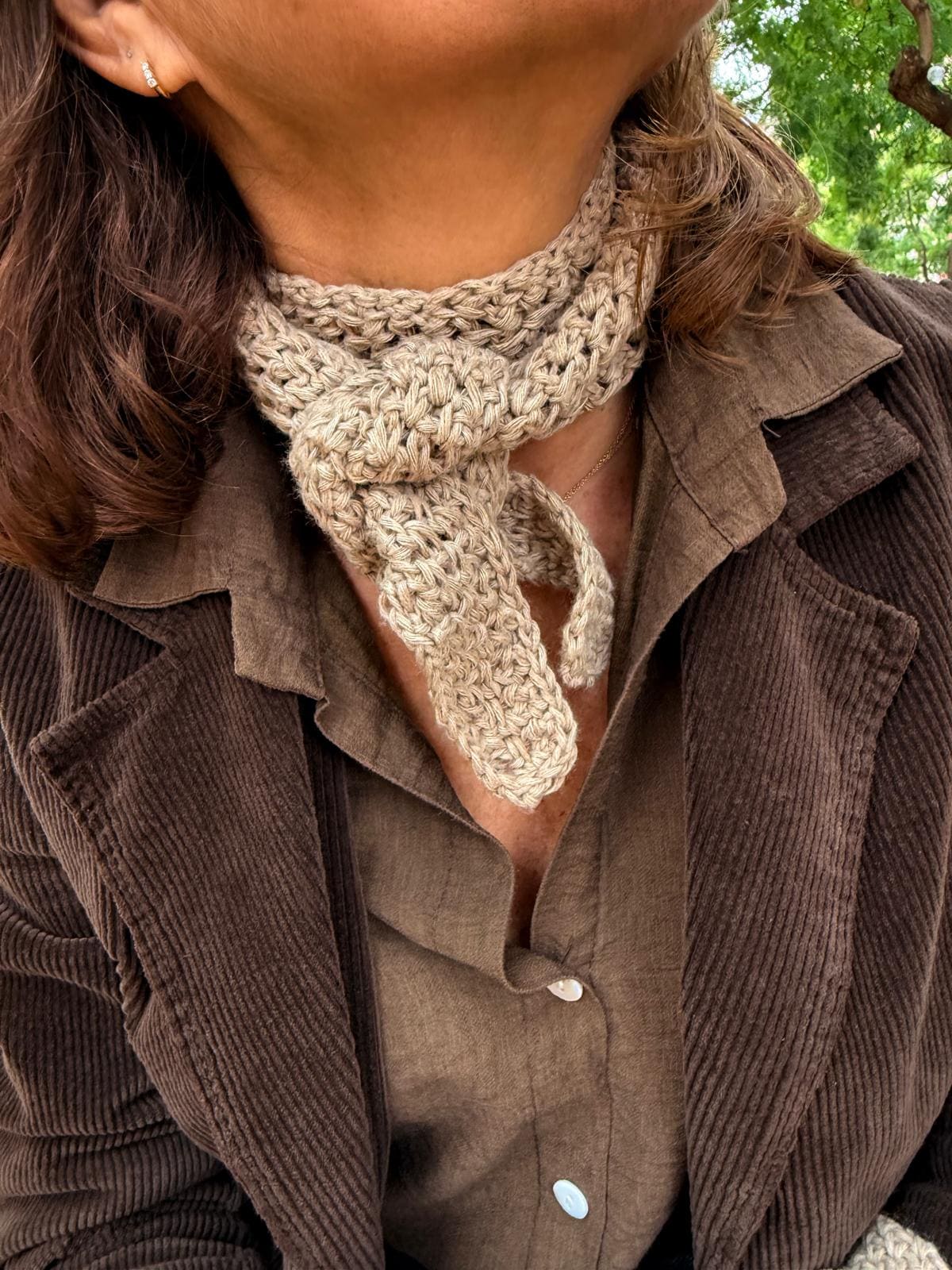 Su formato corto permite anudarla fácilmente al cuello, para llevar calidez sin peso, y su diseño versátil la convierte en un complemento ideal para elevar cualquier look diario con un toque delicado y boho.